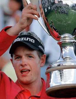 Luke Donald holds up the trophy after he won the European Masters by five strokes for his second European tour victory. [Xinhua]