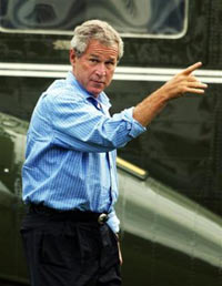 U.S. President Bush points towards the Oval Office, referring to where he is going, upon arrival from a trip to Parkersburg, W.Va., Sunday, Sept. 5, 2004, in Washington. [AP]