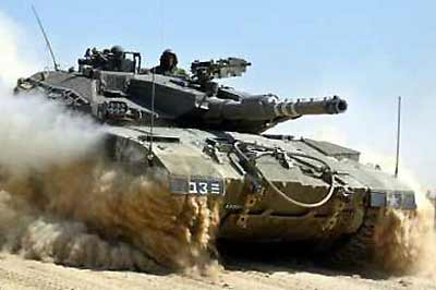 An Israeli tank moves into the Gaza Strip September 8, 2004. Heavy fighting erupted in the northern Gaza on Thursday as a column of Israeli tanks entered the outskirts of the Jabalya refugee camp during a sweep for militants launching rockets into Israel. [Reuters]