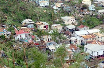 Houses with roofs ripped off on the outskirts of St. George's, Grenada, are seen Wednesday, Sept. 8, 2004 after Hurricane Ivan hit the island on Tuesday. [AP]