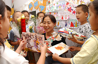 Children at the No.1 Kindergarten of Zhongyuan Oilfield in Puyang, Central China's Henan Province, offer hand-made gifts to their teacher Li Shu on Friday -- the 20th National Teachers' Day, expressing thanks for Li's care. [newsphoto]