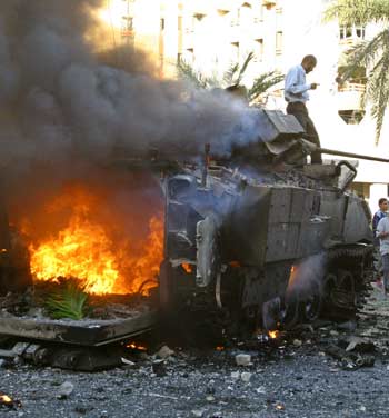 Iraqis celebrate around a burning US Bradley armoured vehicle, following heavy clashes in the centre of the Iraqi capital Baghdad, September 12, 2004. More than a dozen explosions shook central Baghdad at dawn on Sunday and heavy gunfire erupted in a street at the heart of the city, leaving a US armoured vehicle on fire, witnesses said. [Reuters]