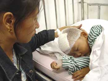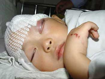 An injured child falls asleep while receiving treatment in a hospital. [people.com.cn]