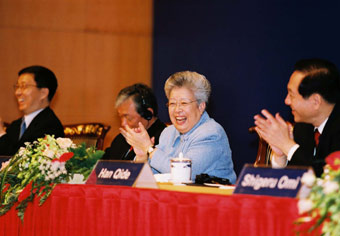 Chinese Vice-Premier Wu Yi (C) gives a speech during the opening ceremony of the 55th session of the World Health Organization (WHO) Regional Committee for the Western Pacific in the city of Shanghai September 13, 2004. [newsphoto]