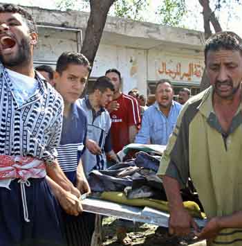Iraqi men carry a stretcher at the scene of an explosion in central Baghdad, September 14, 2004. A huge blast tore through a crowded Baghdad market close to a police station on Tuesday and Reuters witnesses said at least 35 people were killed. The US military and Iraqi the Interior Ministry said the blast was a car bomb attack on a police station in Haifa Street. [Reuters]