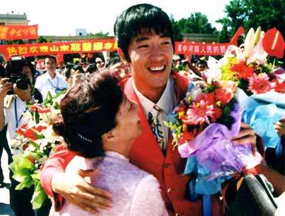 Though she had been ill for sometime, her death still came as a shock for Liu. Stricken by deep sorrow, he swore that from then on, he would do his best to win every competition - only gold would suffice to pay fitting homage to his grandmother, and act as a way to console his grandfather. Few would query Liu Xiang's loyalty to his oath. Whenever he is back in Shanghai after intensive training or a competition, he visits his grandfather, Liu Zhikuan, now 87, and tell him about his training, his life, and the two talk fondly about his grandma. Parental love Of course, Liu is devoted to his parents for their ceaseless help and support. And they in turn, adore their son, who has grown up to be a champion of the world. An only child, Liu Xiang was born in Shanghai on July 13, 1982. The extended family gathered together to discuss what name they should give to the baby. His aunt suggested his parents combine their surnames. This was fine as his mother's name means harmony. "But it immediately occurred to me that if someone adds the word 'sheng,' it would sound as 'Liu Jisheng," - meaning one who always fails to advance in school!" says Liu's mum, Ji Fenhua. They finally opted for "xiang," meaning "spreading wings to fly." Half a head taller than his peers, Liu was encouraged by his sports teachers to become a high jump athlete when in his second year at primary school - a move that caused discord for his parents. "I didn't want our son becoming preoccupied with sports. He was doing ever so well in school, always scoring high in exams and ranking among the top three in his class," recalls mum Ji, a retired pastry cook at the Shanghai Food Processing Factory. But Liu Xuegen, Liu's father, a driver with the Shanghai Waterworks, believed it was a good idea for the young lad to receive the discipline that comes with sports training. "He was too thin and seemed to walk in a strange way," Liu senior recalls. So Liu was allowed to train for the high jump after class. Today, it is no small wonder to learn that the budding athlete was winning the junior track and field tournaments, out jumping his peers. His firstcoach, Gu Baogang, was impressed by his aspiring protege. "The boy had excellent flexibility and great speed. But he also had the most important attributes required to be a great track athlete - a willingness to train hard with competing heart and soul," Gu says. Fearless, Liu Xiang was always the first to volunteer to attempt a jump as coach Gu raised ever higher the bar. He would jump time and time again until he succeeded - a determination that often resulted in bruising. Liu shifted to hurdles in 1996 almost on a whim, winning with ease the 110-metre hurdles during a local secondary school tournament. Watching was Liu's current coach Sun Haiping. "I was surprised to learn the boy had been a high jumper," says Sun. Pinching the boy's muscles in a gesture of disbelief, Sun asked him: "Have you ever thought about hurdles full time?" The rest, as they say, is glorious history. "Hurdles is probably the most unpopular among all sports for kids as it has comparative technical difficulty," Sun adds. With support from those he loved and now under the expert wing of a devoted coach, Liu was allowed to develop and to harness all his inner strengths. And it is this devotion to both his sport and his loved ones that makes Liu stand out from the crowd. He is a young man of endearing contradiction. He is strong, the fastest on earth in his sport. Yet his outer-strength masks a sensitive man. Unlike some spoiled peers of the "only child" generation who take things for granted, Liu Xiang learned from an early age to take care of his grandparents and parents. He helped his grandparents around the house, cleaning and doing the shopping. "My parents led a simple life, devoting themselves to me," says Liu. His mum recalls how worried her then 9-year-old son became when she returned home late one night. "I went to the bathhouse with colleagues after work, but forgot to tell my husband I would be home a bit late." And it was her son's loud crying that welcomed her when she returned. "He said he felt so desperately worried about me as I wasn't home at the usual hour - and that he was thinking about all sort of dangerous things may have happened." East, West, mum's best On the Mothers' Day this year, Liu had just finished an international tournament and returned home planning to buy a bunch of carnations for his mother. But suddenly he changed his mind. "The love for my mother persists every day and night," explains Liu. "There is no difference between other days and Mothers' Day for me on which to show her my respect and admiration." So his gift was simplified into simple words, as his mum recites: "Mum, I wish you forever young." There are many accounts of people from humble backgrounds who become rich and famous and then crash-land in an emotional wreck because what originally drove them had been exploited and drained. But this is unlikely to happen to down-to-earth Liu. Liu's modest family home has a cabinet displaying all his trophies. His historical success in Athens will definitely bring fame and wealth for the young man who has captured the nation's heart with his sprinting and leaping. But Liu's feet are firmly rooted to floor when he considers his new-found stardom : "Money is not the only thing," he says. A larger house for his parents is the only important item on his short lists of wants. The champion and his parents have been living in a two-room apartment in the eastern port city. Their neighbours have followed closely his every success at home and abroad. After he won gold at the Busan 2002 Asian Games, the neighbourhood gave a celebration feast in the office of the residents' committee. Each household cooked a dish for the boy next door. Being the fastest hurdler on the planet is not the only talent Liu harbours. He is said to be an excellent amateur singer. And the champion is also a keen coin co