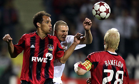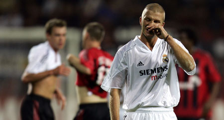 David Beckham reacts on his team's loss against Bayer Leverkusen after