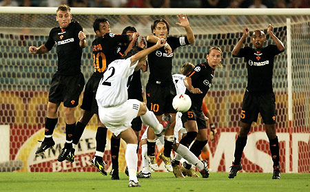 free kick during their Champions League Group B clash at the Olympic