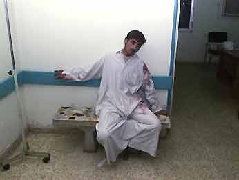 His shirtsleeves soaked in blood from carrying his injured child, a man waits for word on the fate of his child, brought to the hospital Friday September 17 2004, after sustaining injuries during US airstrikes late Thursday night and early Friday morning in Fallujah, Iraq. Hospital officials say at least 30 people were killed and 40 wounded in US strikes on Fallujah and nearby villages.[AP]