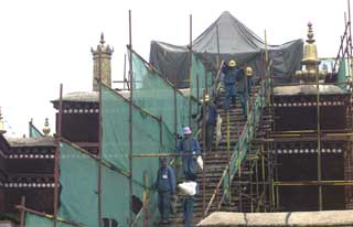With the total investment of 179.3 million yuan, the renovationproject began in 2002. So far, the repair work on the Qamqingtalamu exterior wall and Pingcuoduilang corridor has completed. The patch-up of murals and other decorations inside thepalace are underway, said Qamba. Potala Palace, together with the Norbu Lingka and the Sakya Monastery, are