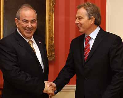 Britain's Prime Minister Tony Blair (R) meets Iraq's interim Prime Minister Iyad Allawi in Downing Street, London September 19, 2004. Allawi insisted on Sunday that elections in Iraq will go ahead in January as planned. [Reuters]