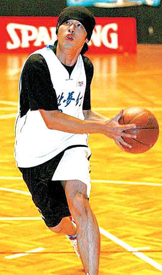 Hong Kong R&B singer Jay Chow is shot before shooting at a friend basketball match between Beijing and Taipei for charity at The Workers' Stadium in Beijing, September 18, 2004. The Beijing team eventually beat Taipei 70-63. [sina]