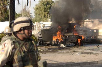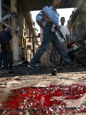 At least 13 vehicles were wrecked and the engine of the suicide car was hurled about 150 feet away. "A man in a black Opel car drove up near the shop and detonated the explosives," said policeman Ahmed Jassem. Human remains strewn over street Ali Jabbar, who owns a nearby shop, helped relief workers to pick up human remains and put them into plastic bags. "I found this in the back of my pickup truck," he said, pointing to a piece of a brain in his hand. Iraqi police and U.S. troops immediately cordoned off the area. Interior Ministry official Col. Adnan Abdul-Rahman said the blast was caused by a suicide car bomber. At least six people were killed and 54 wounded, said Dr. Mohammed Salaheddin of the nearby Yarmouk Hospital. Another car bomb later shook the Mansour district of Baghdad after U.S. troops were seen moving through the area and thick black smoke could be seen rising from the area, police and witnesses said. Police said they believed there were casualties but had no details. The bombings case as U.S. aircraft and tanks attacked Shiite militia positions in fierce fighting in Sadr City, killing 10 people and injuring 92 others, hospital officials said. U.S. forces target Sadr City insurgents The fighting came as U.S. and Iraqi forces searched for weapons caches and targeted "pockets of insurgents and terrorists" in the Shiite stronghold, an east Baghdad slum, the military said in a statement. "The intent is to provide security for the people of Thawra so we can get back to the business of reconstruction," said 1st Cavalry Division commander Maj. Gen. Peter Chiarelli in a written statement. Thawra is an old name for Sadr City.