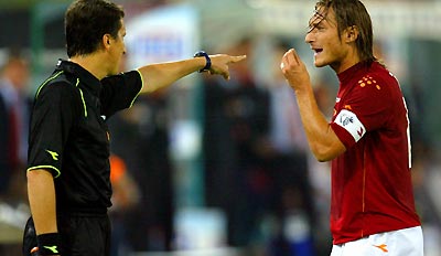 captain Francesco Totti (R) argues with line referee during a Serie A