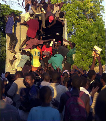 On Thursday, scores of pushing and shoving people jumped on a dump truck carrying relief supplies collected by Rotary Club members from Port-au-Prince, the capital to the south. The truck tried to drive away but the crowd emptied it of food, water, surgical gloves and matches in about 10 minutes.