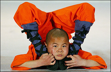 A young monk of China's Shaolin temple demonstrating his skills. The monks have increasingly been using copyright rules to protect their name from rip-offs. [AFP]