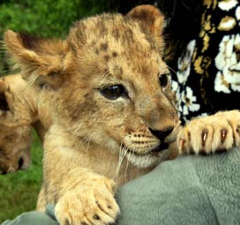 A lion cub is seen on the shoulder of a keeper at Nairobi animal orphanage in Kenya in this July 2004 file photo. [Reuters]