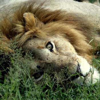 A lion rests in in the shadow of a bush in Kenya's national park Masai Mara in this March 2004 file photo. [Reuters]