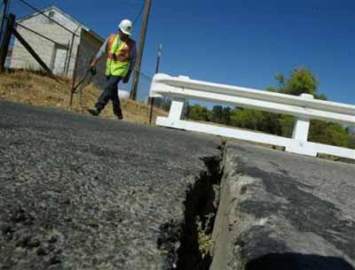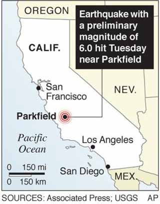 "Things were shaking so bad you couldn't tell where to go next," said Parkfield Vineyard owner Harry Miller, who grows 170 acres of wine grapes. "Trees shaking like brooms, and dust coming from everywhere." The quake tipped over about 300 cases of his wine, and five or six of Miller's buildings — including his home — were damaged. Most of his water pipes burst. The quake struck at 10:15 a.m. PDT and was felt along a 350-mile stretch, as far north as Sacramento and as far south as Santa Ana, southeast of Los Angeles. The center was about halfway between Los Angeles and San Francisco. The very few residents of Parkfield — a half-dozen buildings on either side of a street in a valley surrounded by oak-studded hills — pride themselves on the area's seismic activity. Drivers into town pass a sign reading "Now entering the North American plate." "I'll take my earthquakes over those hurricanes any day," said John Varian, a lifelong resident and owner of the Parkfield Cafe, where food spilled out of the cupboards Tuesday. A magnitude-6 quake can cause severe damage, though any problems are generally far less severe in remote areas and places like California with strong building codes.