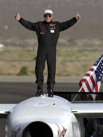 Astronaut Mike Melvill celebrates on top of SpaceShipOne after landing as the Mojave Aerospace Ventures Team attempts to win the Ansari X Prize in Mojave, Calif. on Wednesday, Sept. 29. [AP]