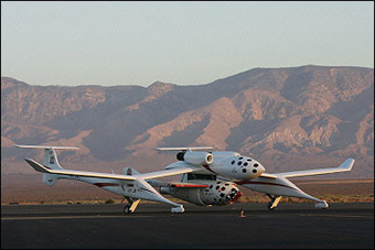 SpaceShipOne attached to White Knight readies for take-off at Mojave airport in California. SpaceShipOne landed back in California at 8:34 am (1534 GMT) after what organizers said was a successful flight into space. [AFP]