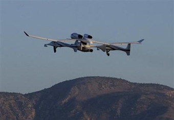 SpaceShipOne takes off, attached to White Knight, as the Mojave Aerospace Ventures Team attempts to win the Ansari X Prize in Mojave, Calif. on Wednesday, Sept. 29, 2004. The $10 million prize goes to the first team to launch the weight equivalent of three people into suborbital space twice within a two week period. [AP]