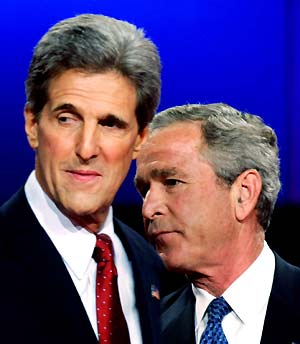 Kerry said he had a four-part plan to battle terrorists, and said Bush's could be summed up in four words — "More of the same." "You cannot lead the war on terror if you keep changing positions on the war on terror," retorted the president. Kerry appeared to taunt the commander in chief at one point during the debate when he said his father, former President George H.W. Bush, had stopped troops from advancing on Baghdad after they had liberated Kuwait during the 1991 Persian Gulf War. Now, he said, the son ordered an invasion of Iraq anyway, without an exit strategy, and under conditions that mean the United States has incurred "90 percent of the casualties and 90 percent of the cost." In response, Bush ridiculed his opponent, saying he denigrated U.S. allies in the war, voted against an US$87 billion measure to aid Afghanistan and Iraq and sent mixed signals. "What's his message going to be? Please join us in Iraq for a grand diversion?" Bush said to Kerry's contention that he could summon broader international support for the war. "They're not going to follow someone whose core convictions keep changing because of politics." Kerry conceded a mistake on one point, but implied it paled next the one he accused Bush of making. "You know, when I talked about the US$87 billion, I made a mistake in how I talk about the war. But the president made a mistake in invading Iraq. Which is worse? Kerry also said Bush erred when he defended the invasion of Iraq by saying "The enemy attacked us." "Saddam Hussein didn't attack us. Osama bin Laden attacked us. Al-Qaida attacked us," Kerry said. Given the stakes, it was not surprising that the two campaigns negotiated what amounted to a 32-page contract that covered debate details. They ranged from the choice of moderator (Jim Lehrer of PBS) to the distance between the candidate lecterns (10 feet). Even so, a last-minute controversy flared, as Kerry's aides objected to the placement of timing lights on the lecterns. |