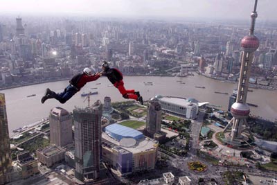 During the 2004 international BASE (Building, Antennae, Span and Earth) jump show held from the top of Jinmao Tower yesterday, six Chinese jumpers joined another 31 from 15 countries to complete the risky feat to loud applause from thousands of onlookers.