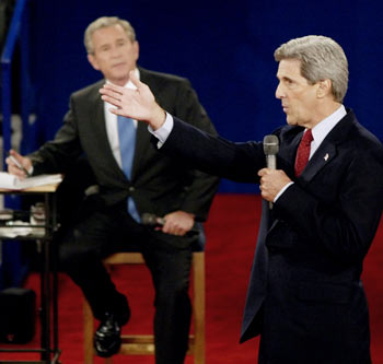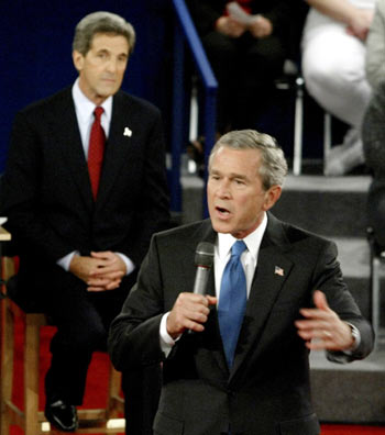 Bush defended both his domestic and international policies after the Labor Department reported today that the economy added fewer jobs than expected in September and a CIA report on Oct. 6 showed Iraq had no weapons of mass destruction, one of Bush's main justifications for the war. "It is a threat that has grown while the president has been preoccupied with Iraq," Kerry said. Bush challenged Kerry's ability to lead the U.S. and allies in a war he called the wrong war at the wrong time. "I don't see we can win in Iraq if you don't believe we should be there in the first place," Bush said. "You've got to be consistent when you're the president. You've got to be firm." L. Paul Bremer, the former top U.S. official in Iraq, said that the U.S. needed more troops at the start of the occupation and Defense Secretary Donald Rumsfeld said he hadn't seen "hard evidence" of a link between Iraq and al-Qaeda. Bush may also have to explain those statements. Kerry Attacks "Two weeks ago, I said he should keep the focus on Iraq and terrorism," which polls show voters trust Bush more to handle, said James W. Davis, a political science professor at Washington University in St. Louis. "My own view now is that he needs to answer questions on it, but if I were him, I would not want to keep the focus on it." Kerry stepped up his attacks on the president's policies in Iraq in recent weeks. Yesterday, he told reporters that Bush and Vice President Dick Cheney "may well be the last two people on the planet who won't face the truth in Iraq." Cheney said in his Oct. 5 debate with Democratic vice presidential nominee and North Carolina Senator John Edwards that invading Iraq was "exactly the right thing to do." Jobs Kerry also says Bush will be the first president since the Great Depression to preside over a drop in employment. According to Labor Department figures, the U.S. economy has 821,000 fewer jobs than when Bush took office in January 2001. In September, U.S. employers added 96,000 workers, short of the 148,000 median estimate of economists in a Bloomberg survey. Bush blames a recession, the Sept. 11 attacks and corporate scandals for job losses during his term. Record homeownership and low welfare rolls are examples of improvement in the economy, he said in an Oct. 6 speech. "The recession is behind us and we're creating jobs again," Bush said. "In the past year, the United States has added about 1.7 million new jobs -- more than Germany, Japan, Great Britain, Canada and France combined." In tonight's debate, moderated by Charles Gibson of ABC News, about 20 uncommitted voters chosen by the Gallup Organization were called on to ask questions, pre-selected by Gibson. The campaigns agreed to rules that direct Gibson to stop any voter who strays from the approved question. Participants' microphones will be cut off after they ask their question so they can't follow up. `Gag the Audience' "What they're trying to do is basically gag that audience," said Alan Schroeder, a professor at Northeastern University in Boston and author of "Televised Presidential Debates: 40 Years of High-Risk TV." The Bush team didn't want the town hall and agreed to it only after concessions on the other debates, he said. "Their next thought was to try to get the rules that they thought might favor Bush." While debate specialists such as Schroeder say that Bush's weakness is thinking on his feet in an uncontrolled environment, they also said he has a strength in connecting with people. Bush topped Kerry when voters were asked who cares more about people and who is more honest and truthful, according to an Oct. 1-3 poll by the Pew Research Center for the People & the Press. Bush holds stylistically similar "Ask President Bush" events that are limited to supporters, most of whom are campaign volunteers. Bush easily works the stage, sleeves rolled up and microphone in hand. Less Formal "Bush seems to warm up in the less formal environment of a town-hall type meeting," said Mark Rozell, a professor of political science at Fairfax, Virginia-based George Mason University. "Of course, Bush's practice with town-hall meetings has all been before friendly GOP audiences so he could end up looking flustered again." Voters in a focus group run by Republican pollster Frank Luntz described the expressions on Bush's face during the first debate on Sept. 30 as arrogant and annoyed. Sixteen of the 18 voters in Luntz's group declared Kerry the winner of that meeting and five switched from undecided to supporting Kerry, Luntz said. None switched to Bush. "After the first debate, all Kerry has to do is look like he can be president. Then he is in play," pollster Dick Bennett, president of the American Research Group Inc. in Manchester, New Hampshire, said before tonight's debate. Bush can't answer questions well in the debates so he's forced to attack Kerry and paint him as a "tax-and-spend liberal," Bennett said. "Part of Bush's problem is that in the first debate he reinforced what a lot of voters think about him," Bennett said. People think Bush is "stubborn, he is not willing to look at the situation objectively. Kerry says `you are the only who sees it this way.' This is what hurts Bush. Bush's father had the same problem on the economy. He didn't get it. He didn't understand what people were talking about." The last of three presidential debates will take place Oct. 13 at Arizona State University in Tempe, Arizona. The debate will have the same format as the first one, with Kerry and Bush standing at podiums. The questions will focus on domestic policy and will be prepared by moderator Bob Schieffer of CBS News. |