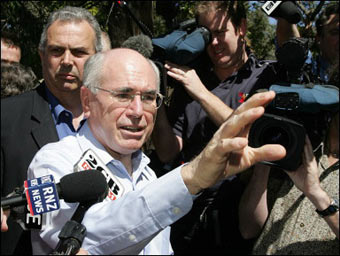Australian Prime Minister John Howard (C) is shadowed by his bodyguard Gary (L) as he claws his way through the media pack. The conservative government of Australian Prime Minister John Howard won a fourth straight term in office as Australia's booming economy overshadowed criticism of his staunch support for the US-led war in Iraq. [AFP]