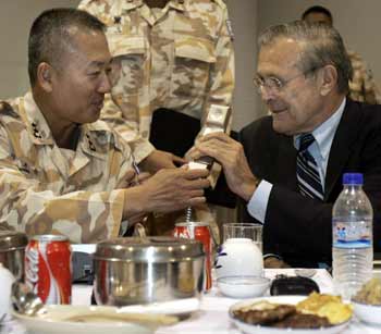 South Korean Maj. General Hwang (L) hands a phone to Secretary of Defense Donald Rumsfeld so he can talk with South Korea's Minister of Defense, Kwang Yung Yoon, during Rumsfeld's visit to the South Korean camp in Arbil, October 10, 2004. [Reuters]
