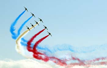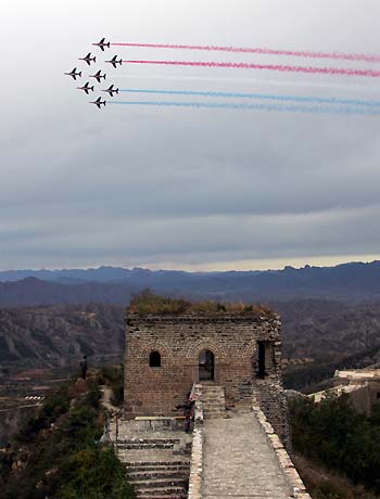 Eight Alpha jets of the French stunt flying team, Patrouille de France, painted the sky above Beijing with the colours of the French flag Monday. The long-awaited demonstration started above the Nanyuan Airport in Beijing. Two scheduled performances, which were to coincide with French President Jacques Chirac's visit to China, were cancelled on Thursday and Sunday due to foggy weather. The team put on a graceful and exciting performance in their twin-engine training and attack aircraft and earned the applause and acclaims of the audience. However, a problem with the wireless communication system of the No.7 jet yesterday prevented the team from making some of the more difficult stunts. The French aerobatics team, also called "The French Patrol" in English, flew over the Great Wall yesterday morning. The Air Show Tour of China is part of the Year of France. The team was formed in 1953 and is one of the oldest full-time military aerobatic teams in the world. It is the first time a French professional aerobatic team performs in China and the first time a show of that kind is held in the capital. After Beijing, the team will head to Wuhan, Hong Kong and Zhuhai. |