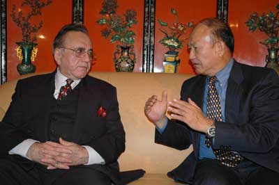 Pakistani FM Khurshid Kasuri (left) calls on Chinese Ambassador Zhang Chunxiang to express regret for Wang Peng's death. [Xinhua]