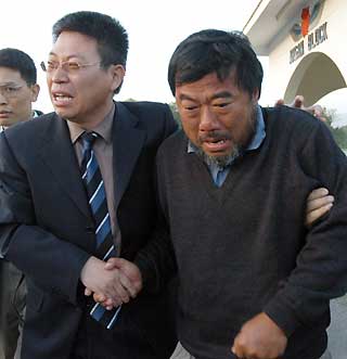 An Unidentified Chinese embassy official (L) escorts the freed Chinese engineer Wang Ende (R) as he arrives in Islamabad October 14, 2004. [Reuters]