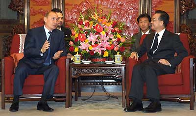 Chinese Premier Wen Jiabao (R) meets with Russian President Vladimir Putin in Beijing October 15, 2004. Putin met several top officials in China's capital on Friday, winding up two days of official talks. [Reuters]