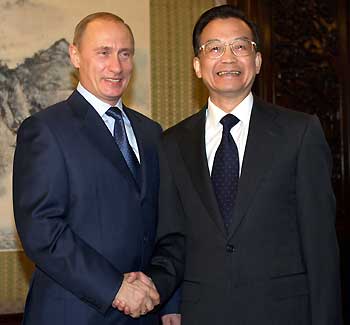 Chinese Premier Wen Jiabao (R) meets with Russian President Vladimir Putin in Beijing October 15, 2004. [Reuters]