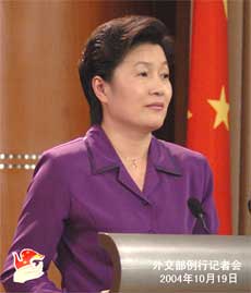Foreign Ministry Spokeswoman Zhang Qiyue presides over a regular news briefing in Beijing October 19, 2004. Zhang said China and Japan will hold talks on disputes over the East China Sea next week. [fmprc.gov.cn]