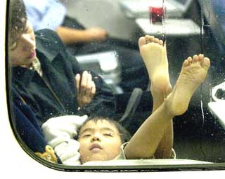 A Japanese mother and child passenger take a rest in a bullet train that is shut down due to Typhoon Tokage at Nagoya station in Nagoya central Japan October 20, 2004. [Reuters]