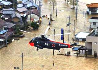 Residents stranded in a river flood are rescued by a Japan Marine Self-defense Force helicopter after deadly Typhoon Tokage brought heavy rain to the western Japanese city of Maizuru, Japan October 21, 2004. Rescuers across Japan were searching on Thursday for 40 people missing after the typhoon raked the country with heavy rains and high winds, killing at least 30 in floods and landslides. [Reuters]