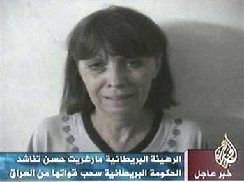 A video grab image shows British-Iraqi hostage Margaret Hassan making an emotional appeal for British forces to withdraw from Iraq in a videotape broadcast an Arabic television channel October 22, 2004.