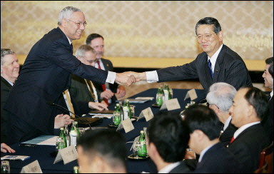 Nobutaka Machimura prior to talks in Tokyo. Powell is on the first leg of an