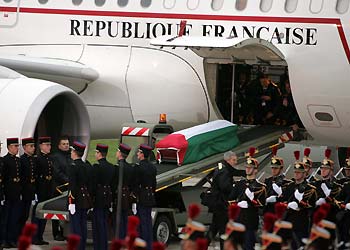 The coffin, borne by eight Republican Guard pallbearers past an honor guard, was draped in a Palestinian flag. Hundreds of mourners lining the streets outside the hospital shouted, "From Paris to Jerusalem, we are all Palestinians!," as the helicopter took off. From France, the body was flown to Cairo for a Friday morning funeral service attended by foreign dignitaries. Egypt frantically prepared for the service in a military club north of Cairo and a short procession led by a horse-drawn carriage. Security forces at Cairo's airport and elsewhere in the city were put on maximum alert for the arrival of the dignitaries. After the service, Arafat's body will be flown to his Ramallah compound for burial. The Israeli military said all West Bank Palestinians would be allowed to attend, though they would have to pass through checkpoints. Only VIPs will be permitted to come from Gaza, a military official said, adding that Israel had information that terror groups would use the funeral to plan an attack. Israeli Prime Minister Ariel Sharon, who has shunned his longtime nemesis as a conniving terrorist and obstructionist, said his death can serve as a "historic turning point in the Middle East" and expressed hope the Palestinians would now work to stop terrorism. In a sign of the enmity the two men shared even in death, Sharon refused to mention Arafat by name. Insisting that with Arafat at the helm it was impossible to discuss peace with the Palestinians, Sharon pushed forward with his "unilateral disengagement" plan. Under the plan, Israel will evacuate the Gaza Strip next year and continue building a West Bank barrier to separate Israelis from Palestinians. Israeli officials have said Arafat's death would have no effect on the plan. And, since Arafat steadfastly refused to groom a successor, it was unlikely any Palestinian leader would emerge in the near future with the clout to make a peace deal with Israel. Nabil Shaath, the Palestinian foreign minister, called on Israel to resume implementation of the U.S.-backed "road map" peace plan, saying Israel had used its dislike for Arafat as an excuse for avoiding obligations to withdraw from West Bank towns. Israel says the Palestinians failed to meet their plan obligation to crack down on militants. President Bush described Arafat's death as a "significant moment" in Palestinian history and expressed hope the Palestinians would achieve statehood and peace with Israel. "During the period of transition that is ahead, we urge all in the region and throughout the world to join in helping make progress toward these goals and toward the ultimate goal of peace," he said. British Prime Minister Tony Blair ¡ª who is expected to press for a Middle East peace push in his planned Friday meeting with Bush in Washington ¡ª said Arafat "led his people to an historic acceptance and the need for a two-state solution." That was something "we must continue to work tirelessly to achieve," Blair said. Former President Carter called Arafat "a powerful human symbol and forceful advocate" for the Palestinians. French President Jacques Chirac paid his respects at the hospital shortly after noon Thursday. He hugged Suha Arafat before leaving. Suha Arafat, with whom Arafat had a daughter, initially restricted access to her husband and publicly accused the Palestinian leadership of trying to usurp his powers. But the dramatic dispute was resolved after top Palestinian officials flew to France to check on their leader. Chirac eulogized Arafat as a "man of courage and conviction," but others were more tempered, reflecting the vastly different images of the Palestinian leader. "Yasser Arafat's life stands for the varied and tragic history of the Palestinian people and the Middle East as a whole." German Foreign Minister Joschka Fischer said. "In it were reflected many people's hopes for peace, but time and again also their disappointments and setbacks." As much of his life was filled with controversy, so, too, was Arafat's death. The Palestinians had demanded he be buried in Jerusalem on the disputed holy site that once held the biblical Jewish temples and now holds Al Aqsa Mosque, Islam's third-holiest shrine. Israel refused, fearing a Jerusalem burial would strengthen Palestinians' claims to a city they envision as a capital of a future Palestinian state. In a compromise, the Palestinians agreed to bury him at his compound here, the muqata, battered and strewn with rubble from repeated Israeli raids. But they plan to line his grave with soil taken from the Al Aqsa Mosque compound, said Ahmed Ghneim, a Fatah leader, and he is to be interred in a cement box so his body can be moved to Jerusalem when the opportunity presents itself. A visual constant in his checkered keffiyeh headdress, Arafat kept the Palestinians' cause at the center of the Arab-Israeli conflict. But he fell short of creating a Palestinian state, and, along with other secular Arab leaders of his generation, saw his influence weakened by the rise of radical Islam in recent years. Revered by his own people, Arafat was reviled by others. He was accused of secretly fomenting attacks on Israelis while proclaiming brotherhood and claiming to have put terrorism aside. Many Israelis felt the paunchy 5-foot, 2-inch Palestinian's real goal remained the destruction of the Jewish state. Arafat became one of the world's most familiar faces after addressing the U.N. General Assembly in New York in 1974, when he entered the chamber wearing a holster and carrying a sprig. "Today I have come bearing an olive branch and a freedom fighter's gun," he said. "Do not let the olive branch fall from my hand." Two decades later, he shook hands at the White House with Israeli Prime Minister Yitzhak Rabin on a peace deal that formally recognized Israel's right to exist while granting the Palestinians limited self-rule in the West Bank and Gaza Strip. The pact led to the 1994 Nobel Peace Prize for Arafat, Rabin and then-Foreign Minis
