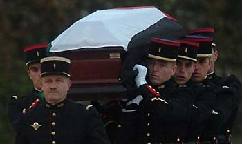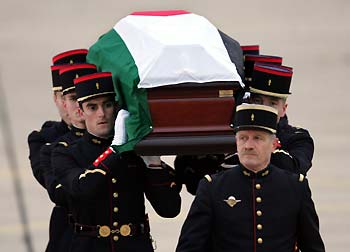 Arafat's body was taken from Percy Military Training Hospital and placed aboard a French army helicopter for a short flight to Villacoublay military airfield outside Paris and a small ceremony involving French Prime Minister Jean-Pierre Raffarin, Foreign Minister Michel Barnier and Suha Arafat.