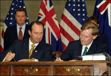 A free trade agreement between the United States and Australia should be completed by next week, Trade Minister Mark Vaile (L) says, seen here signing the pact with US Trade Representative Robert Zoellick. [AFP/file]