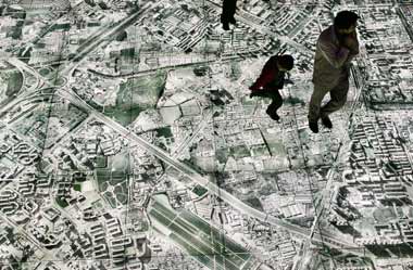 Visitors walk on an aerial map of China's capital including the Olympic venues at Beijing Urban Planning Exhibition Centre. [Reuters]
