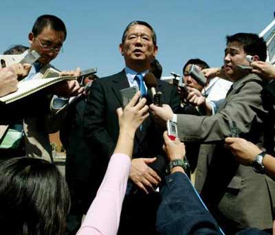 Japanese Foreign Minister Nobutaka Machimura (C) speaks to journalists after a private meeting with his Chinese counterpart, Li Zhaoxing, during a break in a meeting of Foreign and Trade Ministers from the 21 economies belonging to the Asia Pacific Economic Cooperation (APEC), in Santiago, November 18, 2004. [Reuters]