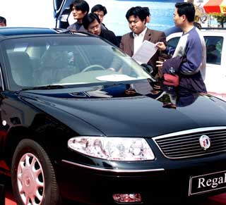 Customers show an interest in Buick Regal, a product from Shanghai GM Co, in a car dealer's office in Nanjing, Jiangsu Province November 23, 2004. The company announced to recall over 27,000 such models due to its vacuum hose defect. [newsphoto]