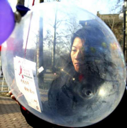 promotion booklet before a blown-up condom at a Beijing campus.