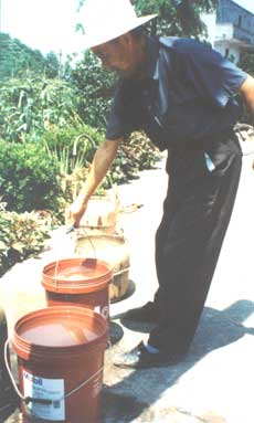 A farmer in Yichang, Hubei Province, fetches murky water and lets it silt for drinking in this July 7, 2004 file photo. China plans to provide safe and clean drinking water to all by 2020. [newsphoto]