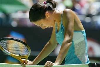 Anastasia Myskina of Russia leans on the net during her first round match against Kveta Peschke of the Czech Republic at the Australian Open Tennis Championships in Melbourne, Tuesday Jan. 18. 2005. Myskina won the match 6-1, 6-4. [AP]